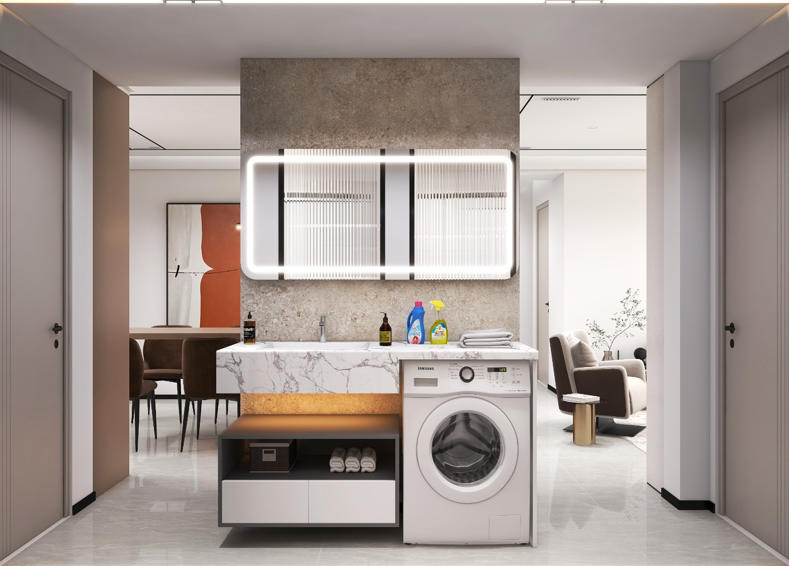 浴室柜洗衣机外置洗手洗衣方便,放在玄关背后既不会影响美观 也让空间充满趣味性。