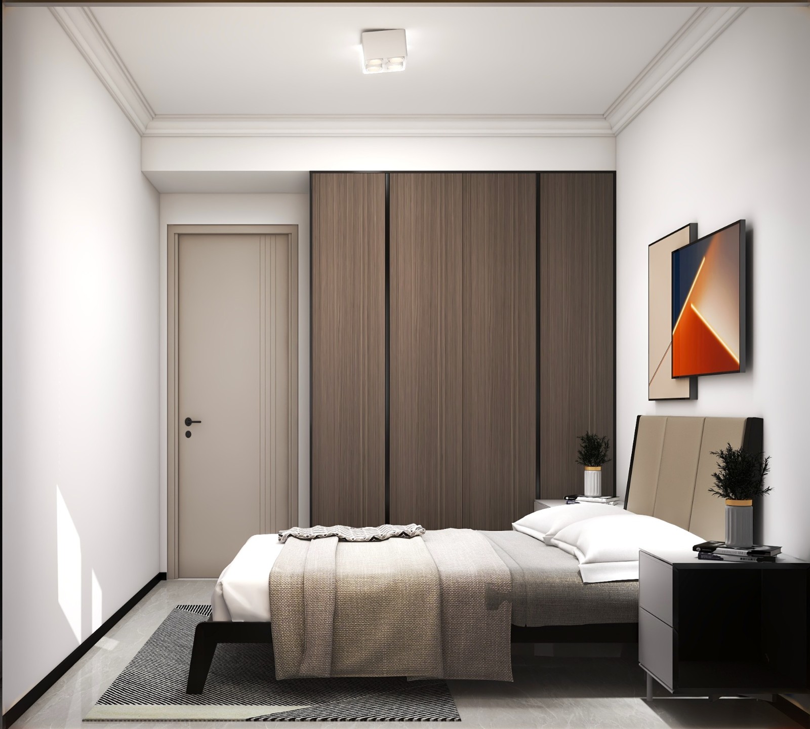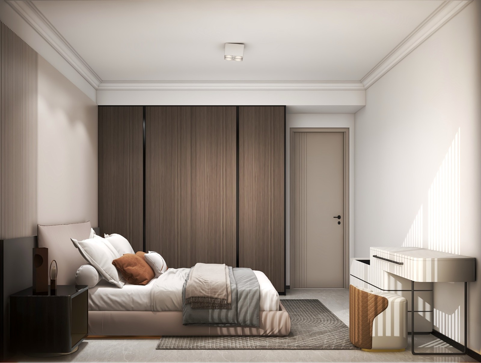 次卧室深色柜子衔接外面的柜体,软装搭配简约时尚。
