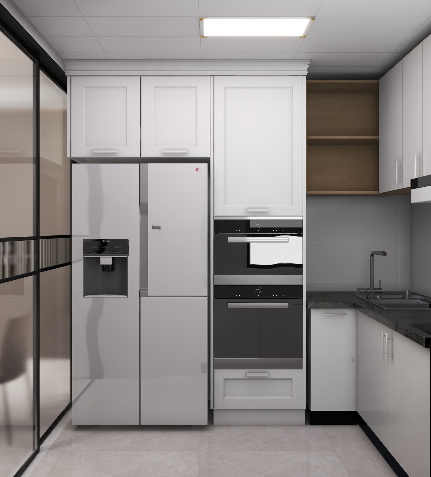 冰箱做嵌入式,旁边做电器柜。方便储物还能方便使用。