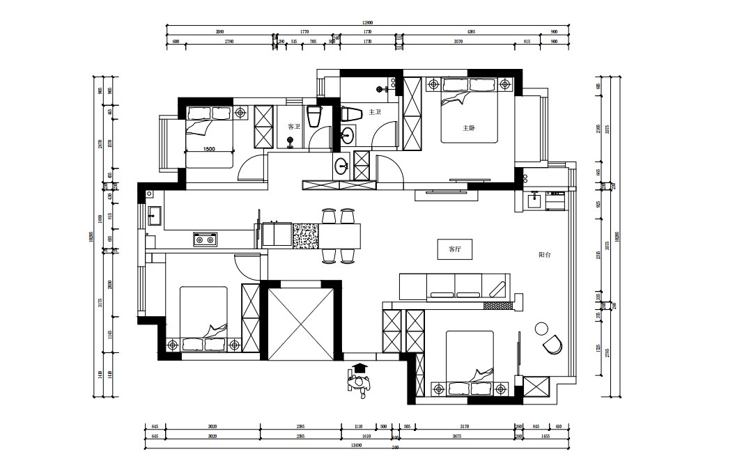 本案业主一对拥有一双儿女的年轻夫妻,四个房间房间都需要用做卧室,业主希望在有限的空间里能做到更多的储物空间,房子更显大,还能有大餐桌,收纳不能少,业主一家都偏爱实用主义的现代装修,大气耐看。