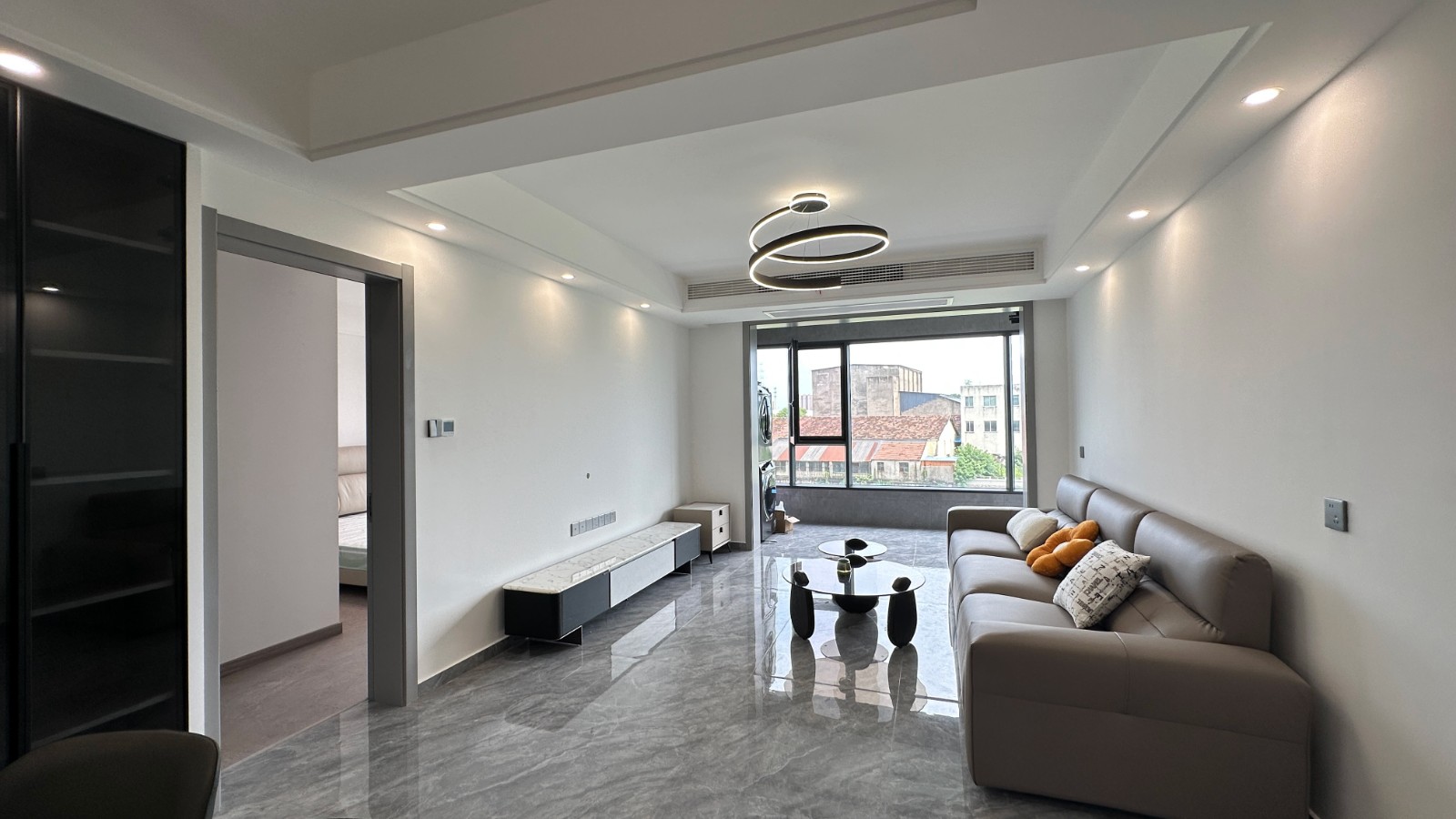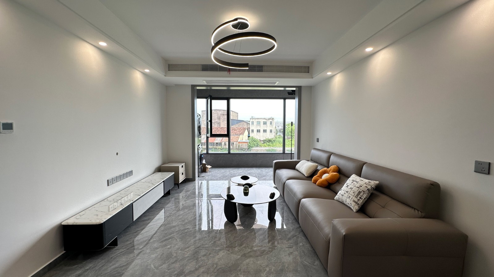 客厅太阳透过玻璃窗,点亮屋里的每一个角落,同时也照出了温馨的家居生活。双阳台改善视觉通透感,扩大了活动空间。