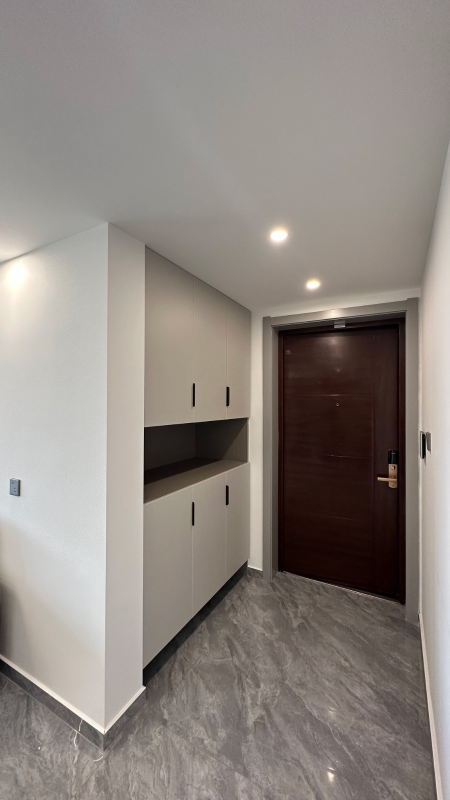 玄关空间比较充足,设计一排玄关柜,不仅可以收纳鞋子,也可以在进出门时放置随身物品,深浅搭配的柜体,色彩上更加高端。