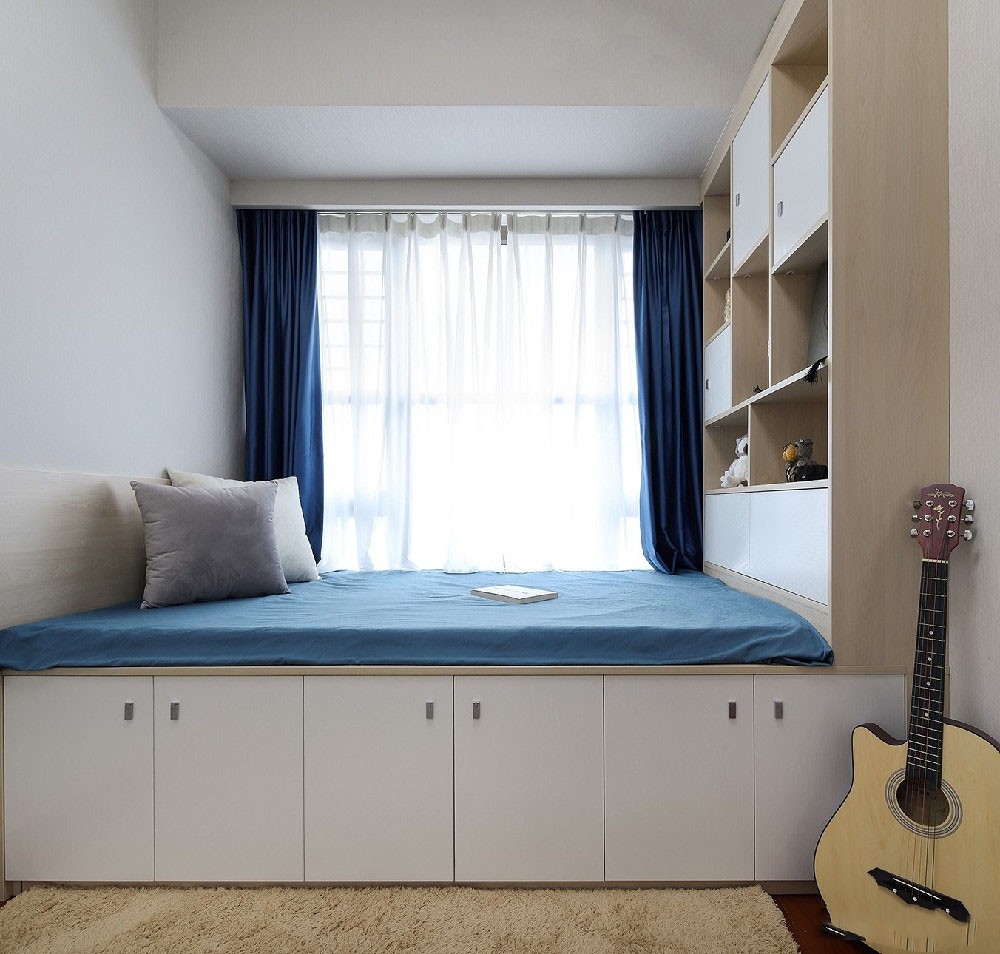 次卧采用榻榻米的形式,使床铺直接连接到顶的储物柜,在保证功能完整的前提下让空间更合理利用,实现了储物空间的***化。