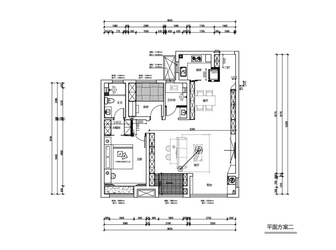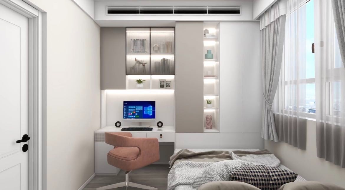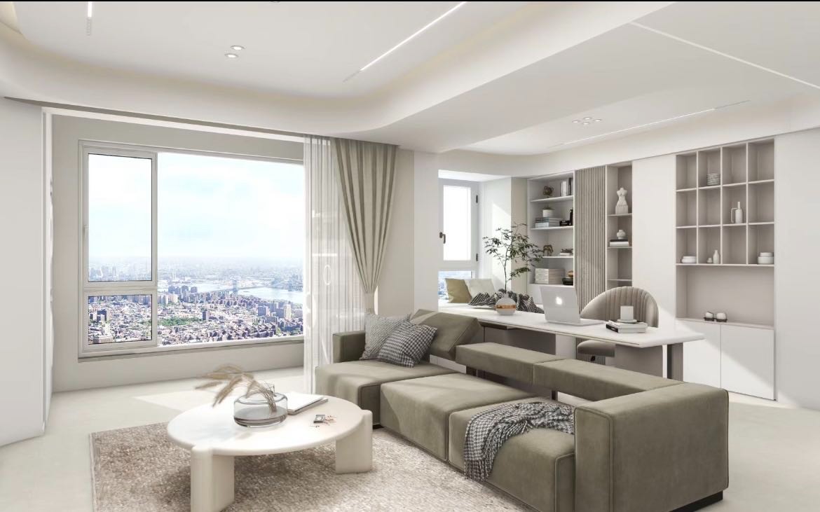将南向次卧室与客厅墙体打通,使其成为客厅书房结合-- 体的开敞空间,增大空间的开阔性和通透性,同时满足空间功能得到充分使用。