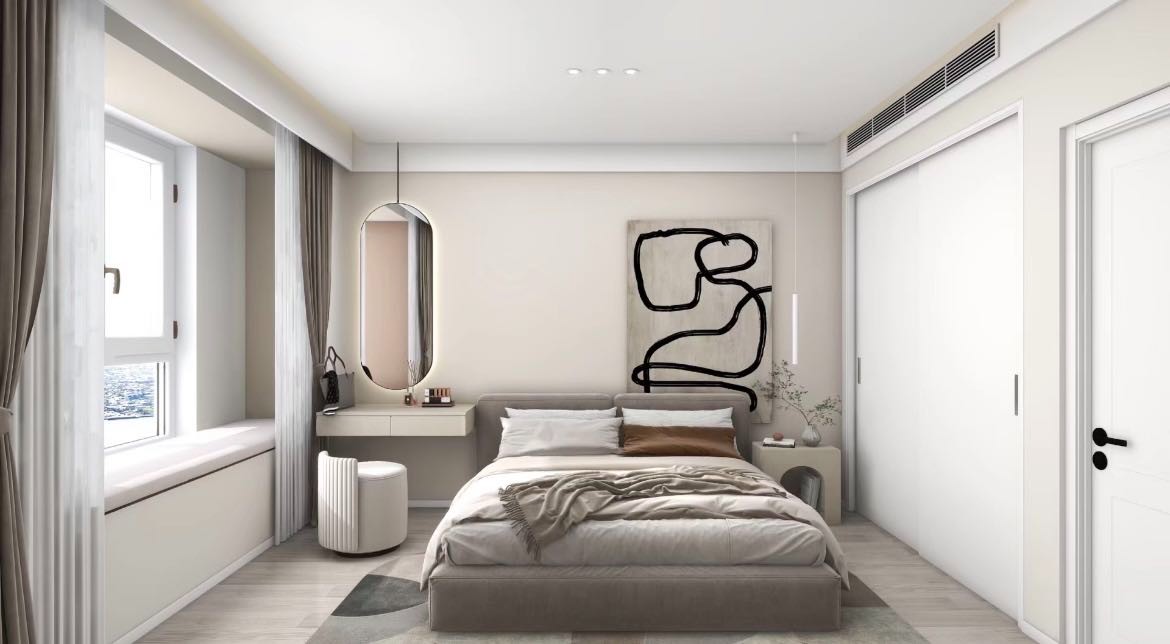 主卧而简约主义所崇尚的正是通过流动的线条、质感的材料及整体协调搭配让人在日趋繁忙的生活中,得到一种能彻底放松