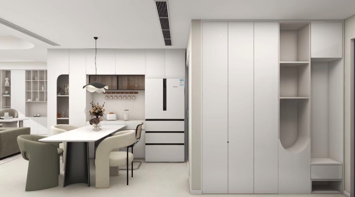 厨房餐厅空间较小,将入户墙体改为s型墙体,缩小入户鞋柜间,为冰箱提供空间。
