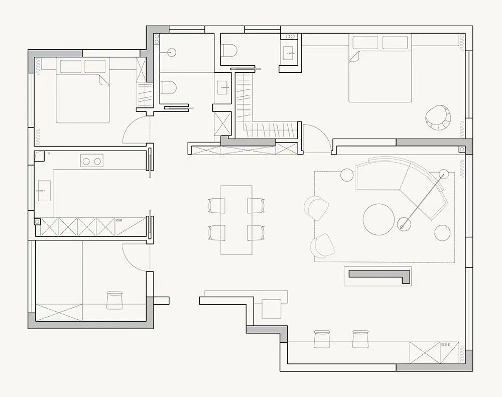阳台打开后完成以这个承重墙形成一个环形动线,模糊了书房与客厅之间的界限。