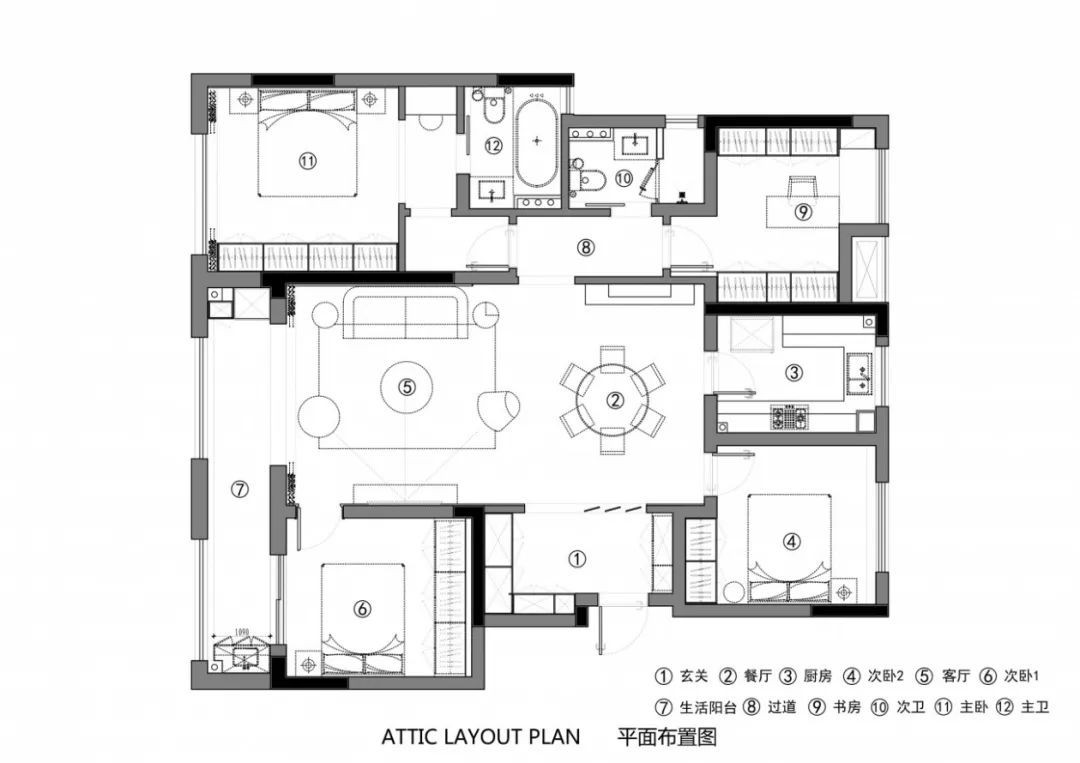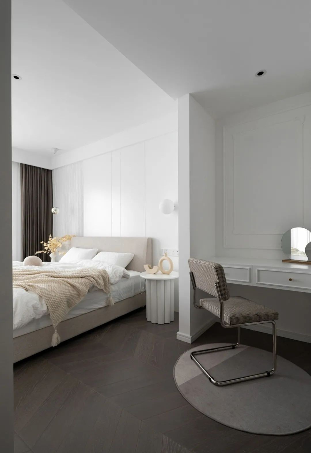 卧室旁边的小角落还加入了一个小梳妆台的位置,椅子下还有一张圆形地毯,为主人营造了一个轻松优雅的化妆小角落。
