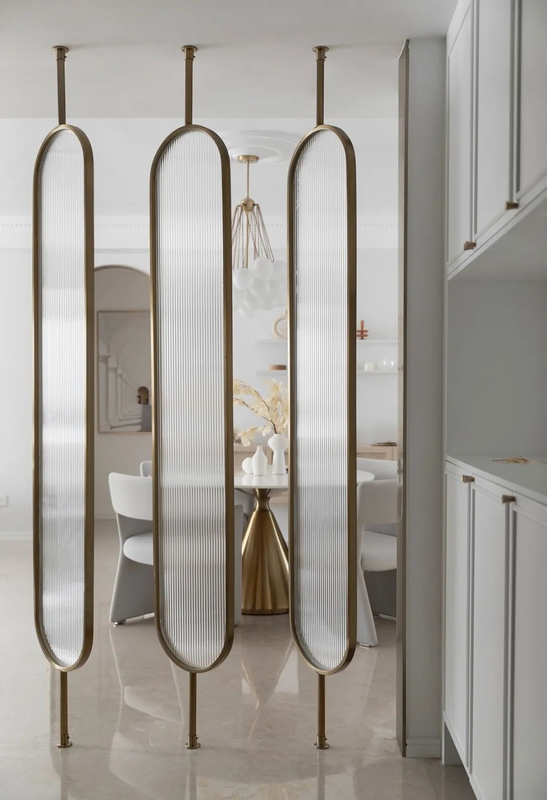 玄关的大门对着餐厅区域,在中间加入3道金属+长虹玻璃的椭圆造型屏风,后方精致的餐桌椅布置若隐若现的效果,一进门就感受到了一种轻奢的优雅。右侧鞋柜在底部与中间加入开放空格,装上轻奢的柜门,也让玄关功能实用优雅。