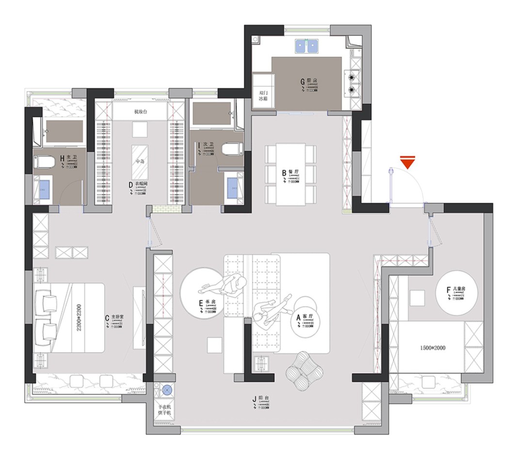 户型为四房的格局,因为业主小夫妻均是本地人,双方父母在附近都有自己的房子住,故不会跟屋主一起居住,这样就有了户型优化的条件。