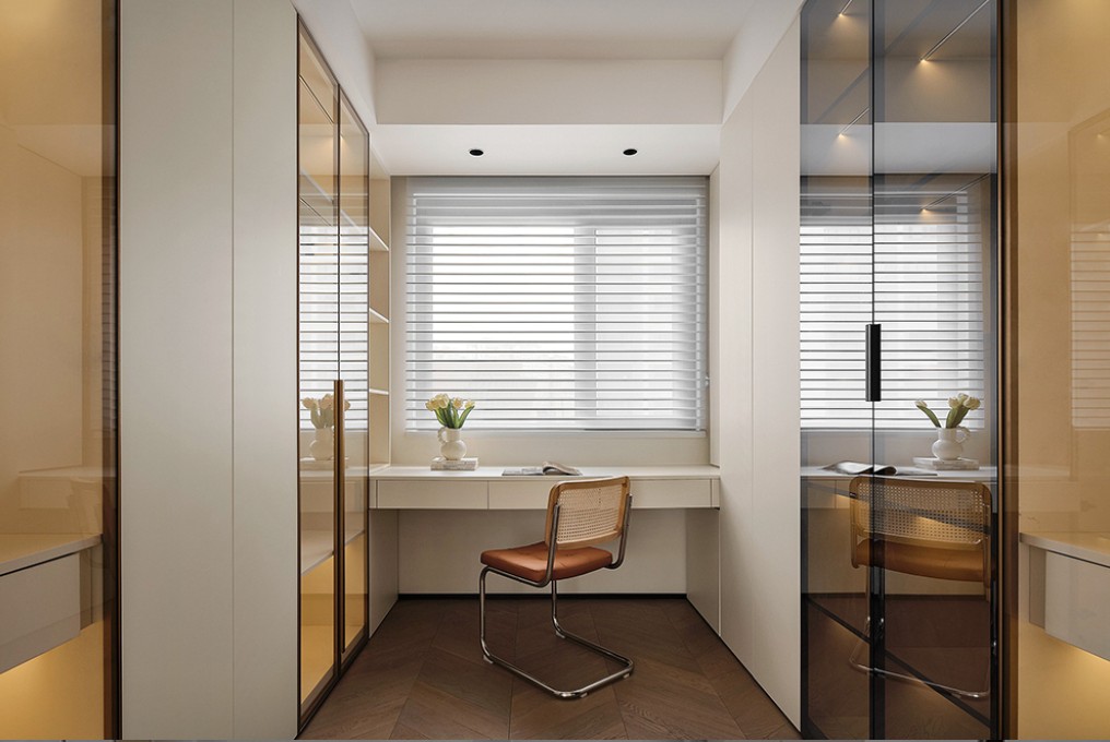 衣帽间里靠窗户边的明亮的梳妆台,窗帘用的柔纱帘。