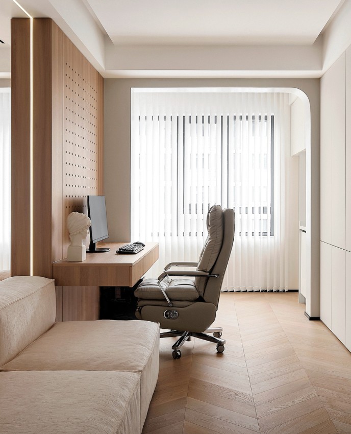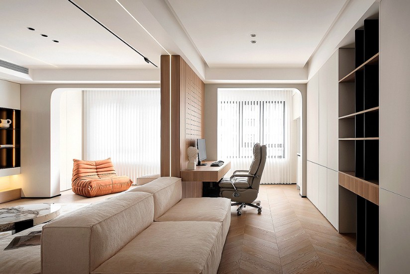 开放式书桌,是利用了不能拆的承重墙体,墙面的洞洞板可以随时改变层板的位置和数量。