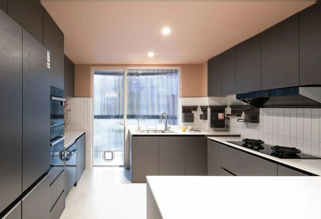 厨房将小阳台纳入,花砖地面搭配墨绿色墙砖,吸睛又耐看