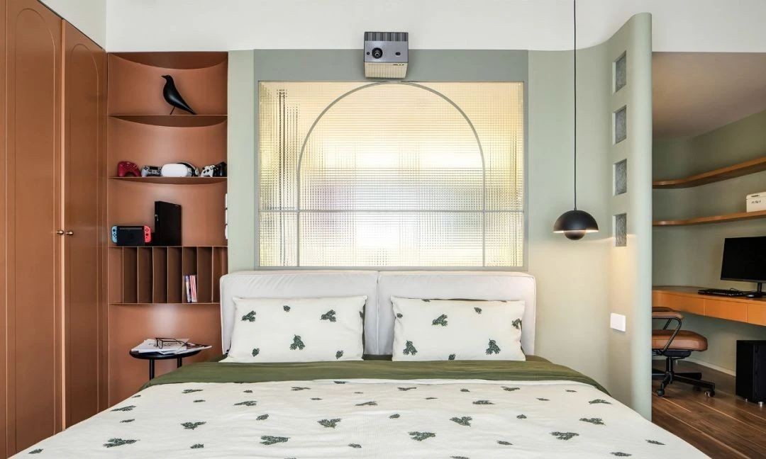 主卧选用屋主喜爱的陶红+豆绿,与胡桃木地板搭配,营造出馥郁的复古氛围,与主卫之间的隔墙设计玻璃隔断,确保采光与私密性,在颜值上也得到极大提升