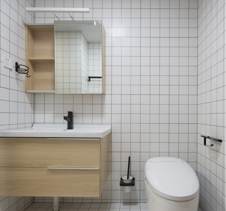 卫生间整体黑白原木色搭配
