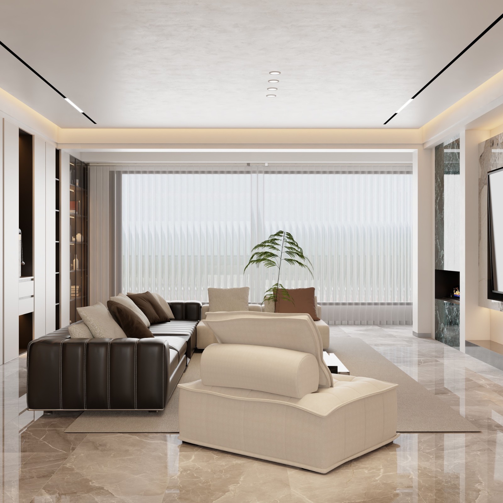 沙发背景墙整体木饰面做装饰,点缀一些氛围灯带。让整个背景墙灵动起来。