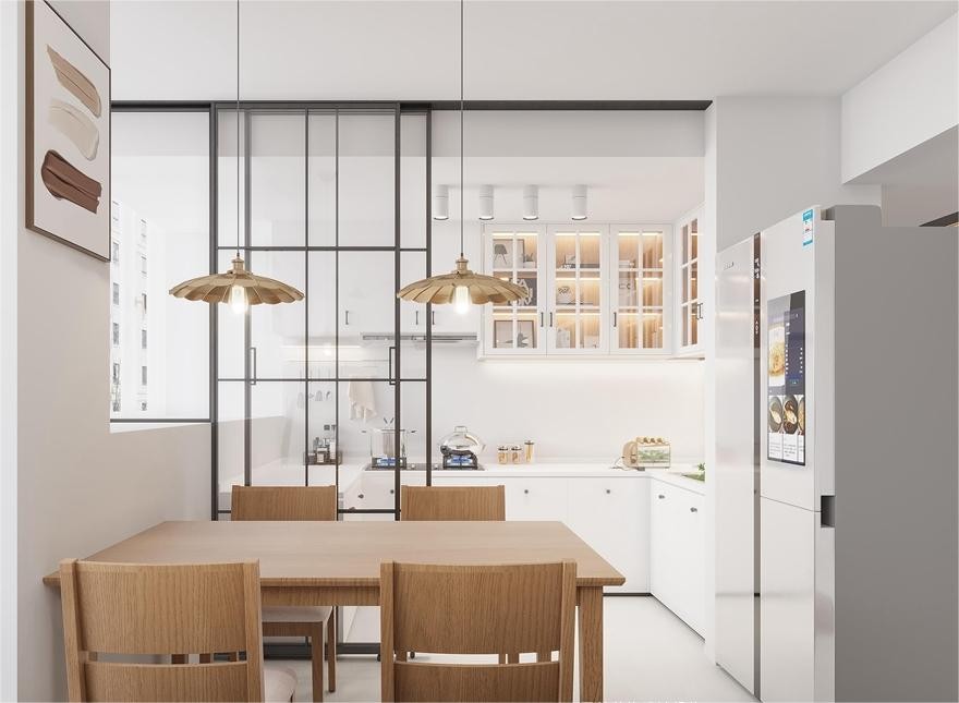 半开放式厨房,和客厅之间动线更流畅,也便于家人之间互动。