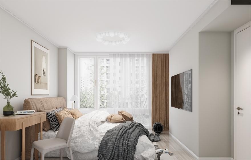 卧室要求去繁留简,采光是***位的,所以床位墙面大面积留白,一是增加了空间延展性,二让卧室的采光更通透。