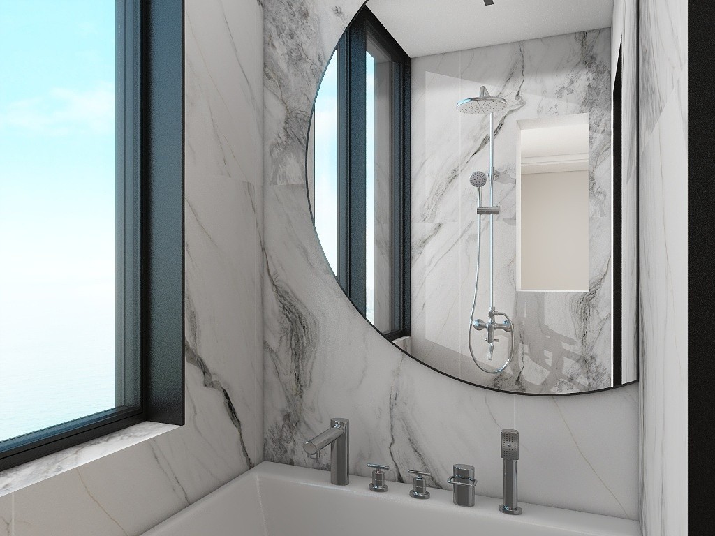阳台之间隔一个淋浴间,放置花洒和浴缸