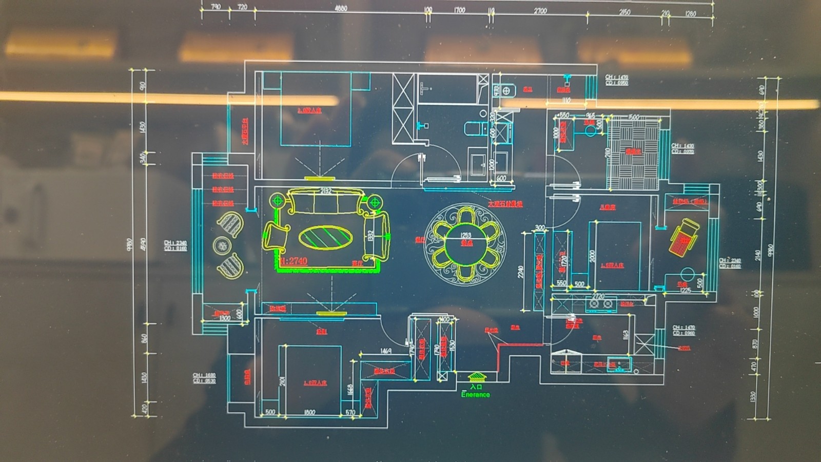 入户次卧与客厅的电视背景墙相连,两侧特殊的超长长虹玻璃设计,起到扩展空间的作用,能够让视觉上有延伸感。