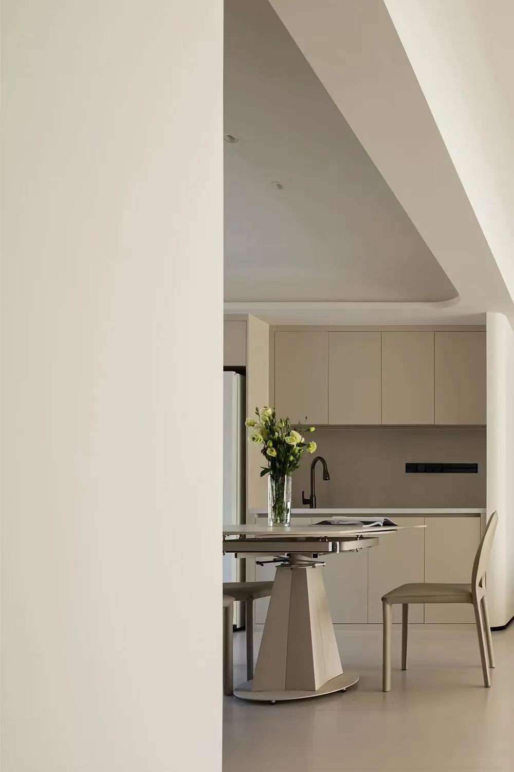 餐厅以温柔的奶油色为主基调,搭配低饱和度的灰色餐椅,尽显舒适治愈的暖色调。
