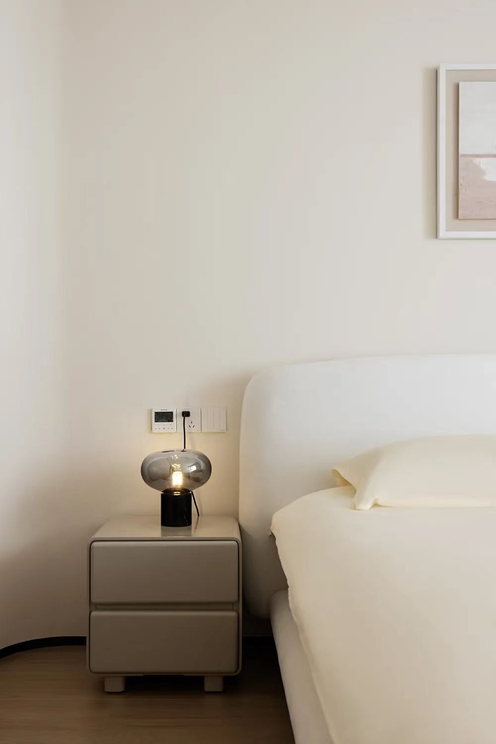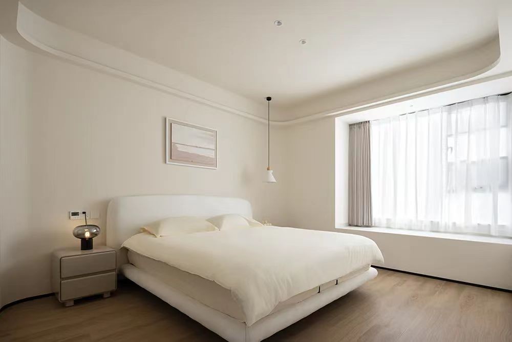 浅色木纹砖、极简风挂画,无主灯的设计搭配圆润造型的台灯,给空间注入温馨感,打造柔和温暖又极具质感的卧室。