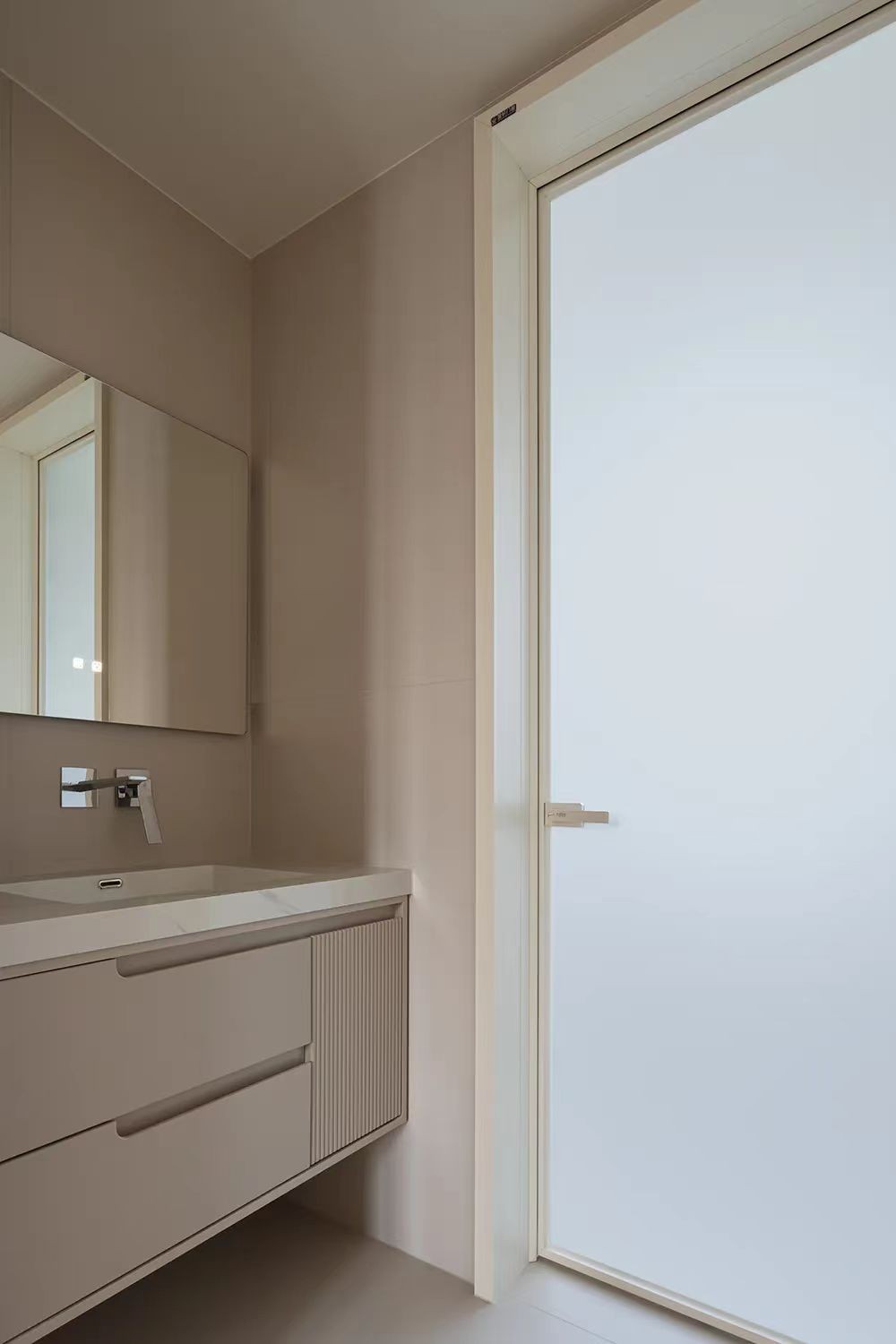 干湿分离设计,满足日常业主的需求,咖色浴室柜搭配奶白色油砂玻璃门,很温馨。