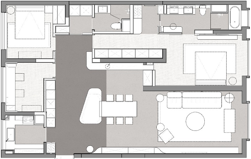 客厅的电视墙连成一线,弧度的设计使其衔接自然;入户时的下天花与客餐厅区域的上天花,两相对比,空间拉高;吊顶边缘的线条勾勒出天花层次,应用圆弧形的精致收口,吊顶、定制石膏线与墙面自然过渡,增加了房屋精致度。