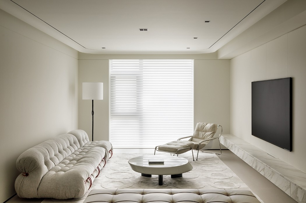 蛋壳白为主调的客厅与透过香格里拉帘进入室内的柔和自然光,呈现出不用层次的白,简单温馨;