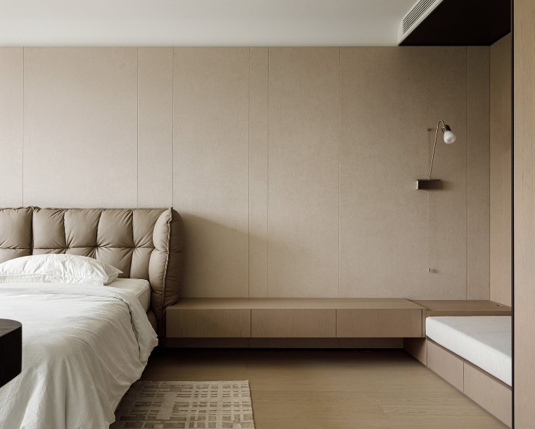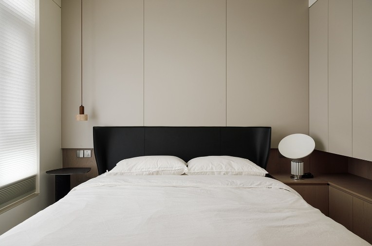 客卧以浅灰与咖色为主题色,配以黑色床具,尽显沉稳大气;悬挑衣柜与同色床头背景墙无缝连接,弱化了柜体本身对床体的压迫感;衣柜下设储物抽屉,与床头柜一体设计。