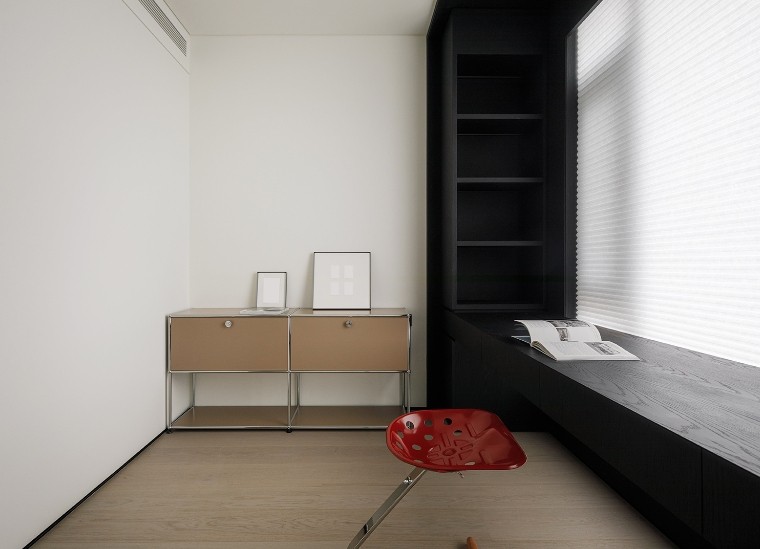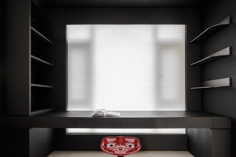 书桌两侧配置书柜,可放置书籍或收纳小物;香格里拉帘使得室内的光线柔和,适宜沉浸办公。
