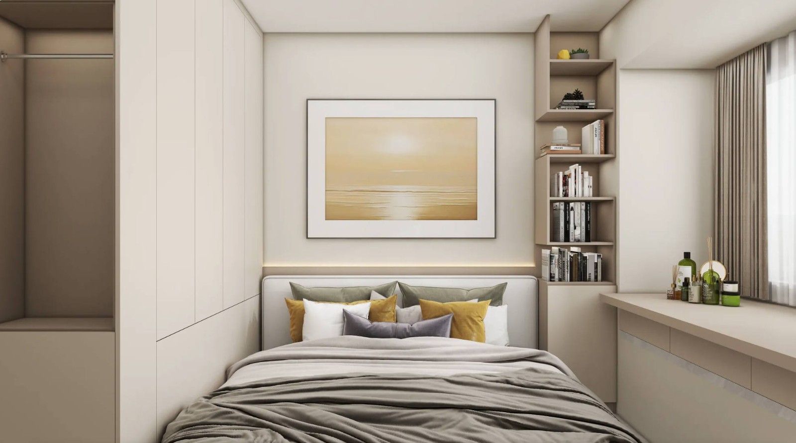 黄色灰色咖色为主,给卧室安静温柔的感觉。