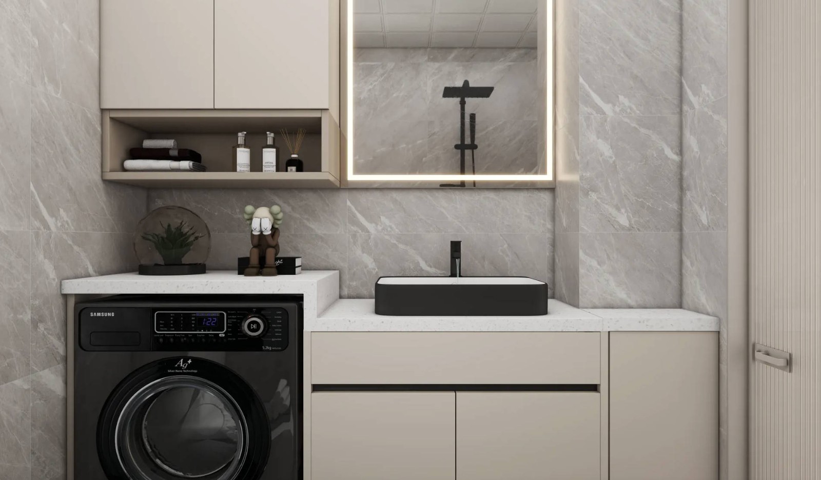 卫生间浴室柜台上盆与洗衣机颜色呼应给空间和谐感