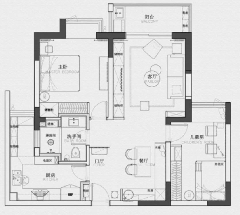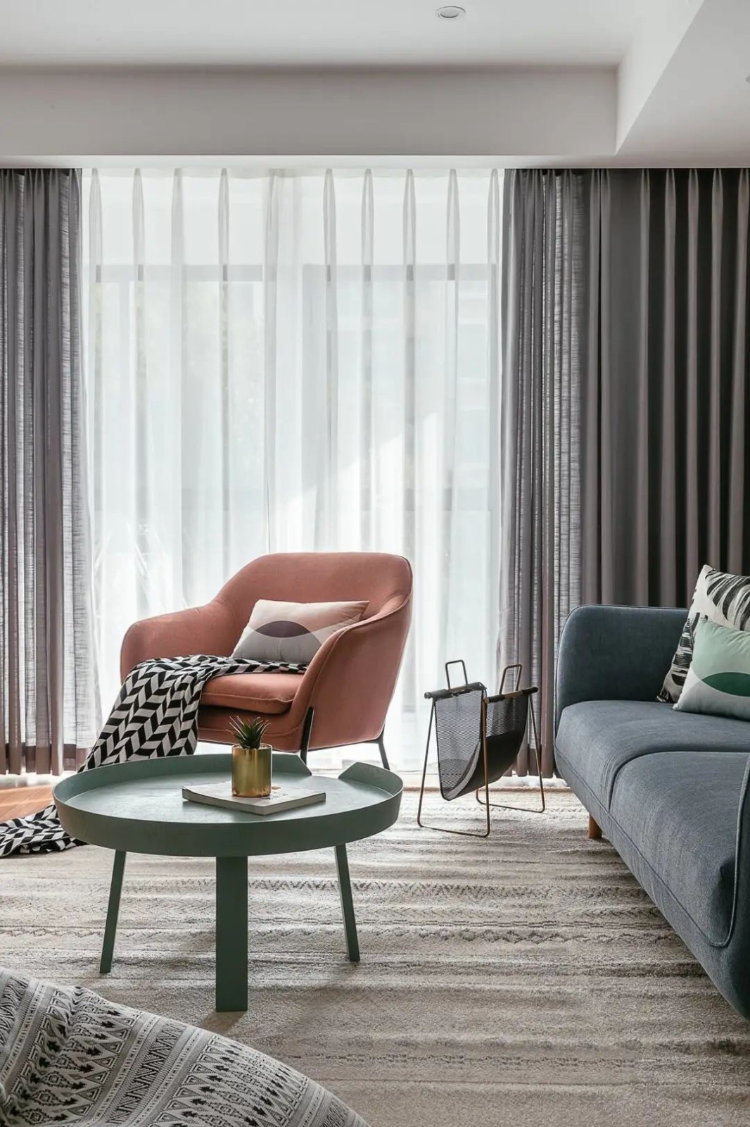 浅灰色的窗帘,黑白相间的毯子及地毯,三者之间有了很好的呼应,为了避免单调乏味,所以特意选了蓝色的沙发,黄色及绿色的茶几等,因为有了这些颜色的加入,空间立刻变得活跃起来。