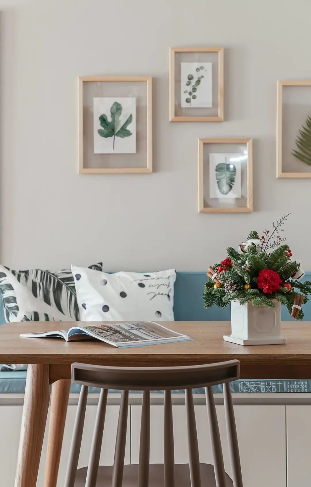 为了凸显活力与生机,绿植的加入是非常重要的,所以无论是挂画还是台面的摆件选的都是绿植。