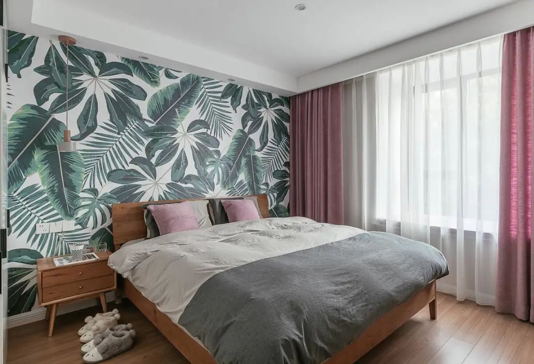 主卧的床头背景墙大面积铺贴绿植墙布,再搭配实木床,有种现代与复古并存的感觉,粉色窗帘的加入,让卧室也变得浪漫起来。