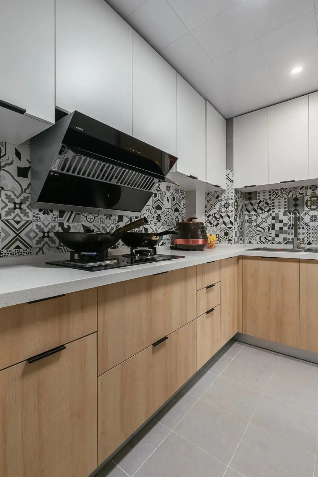 厨房地面采用灰色的防滑砖,不仅防滑又耐脏,橱柜同样也是延伸了客厅和主卧的色调既是木色+白色,而墙面采用黑白灰花砖,因此无论是色调上,还是材质上的搭配都显得北欧风十足。
