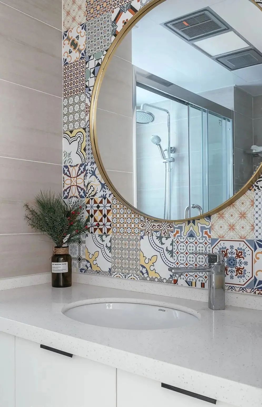 洗漱台正墙面采用彩色的花砖来点缀,显得年轻又时尚