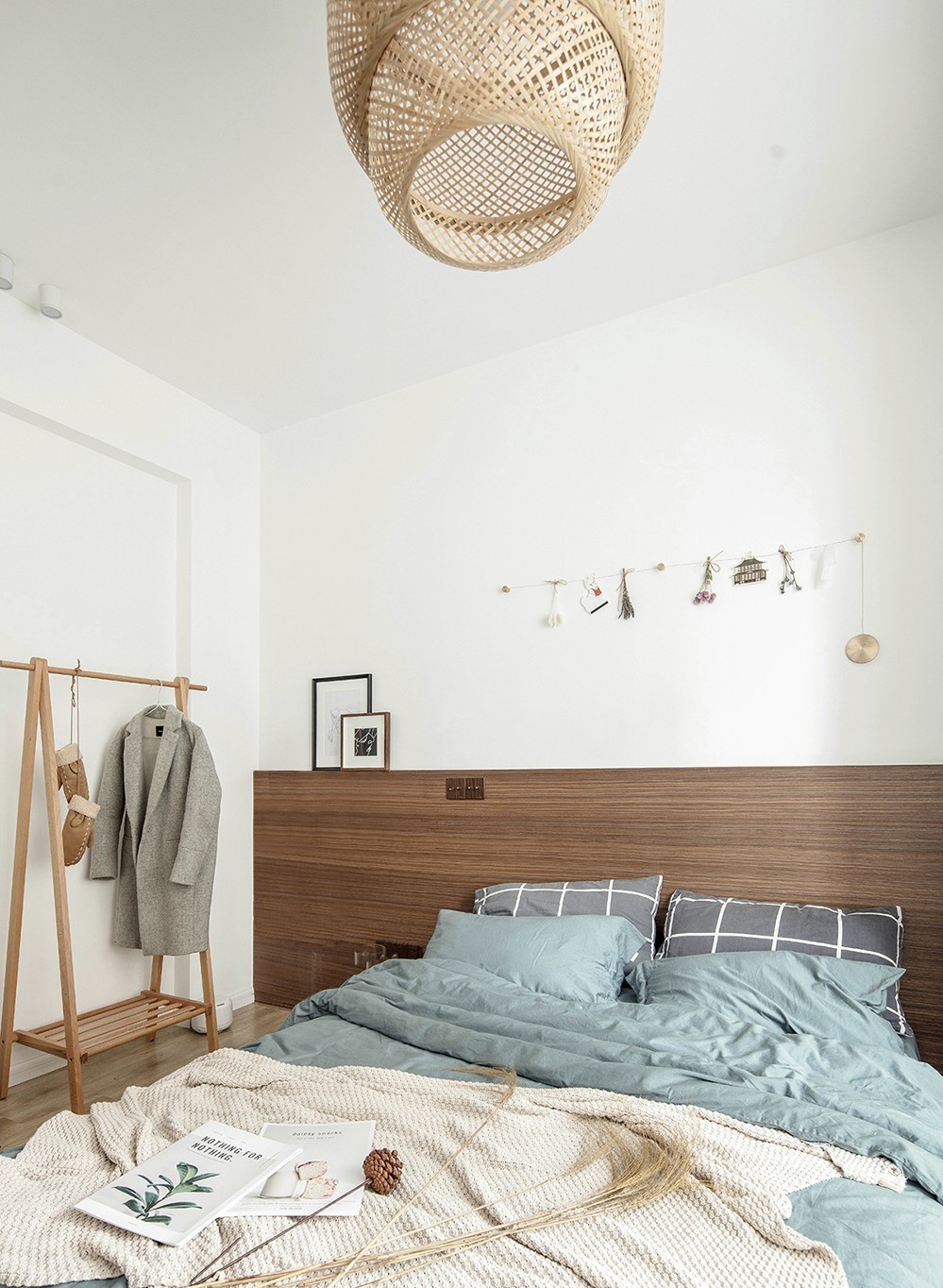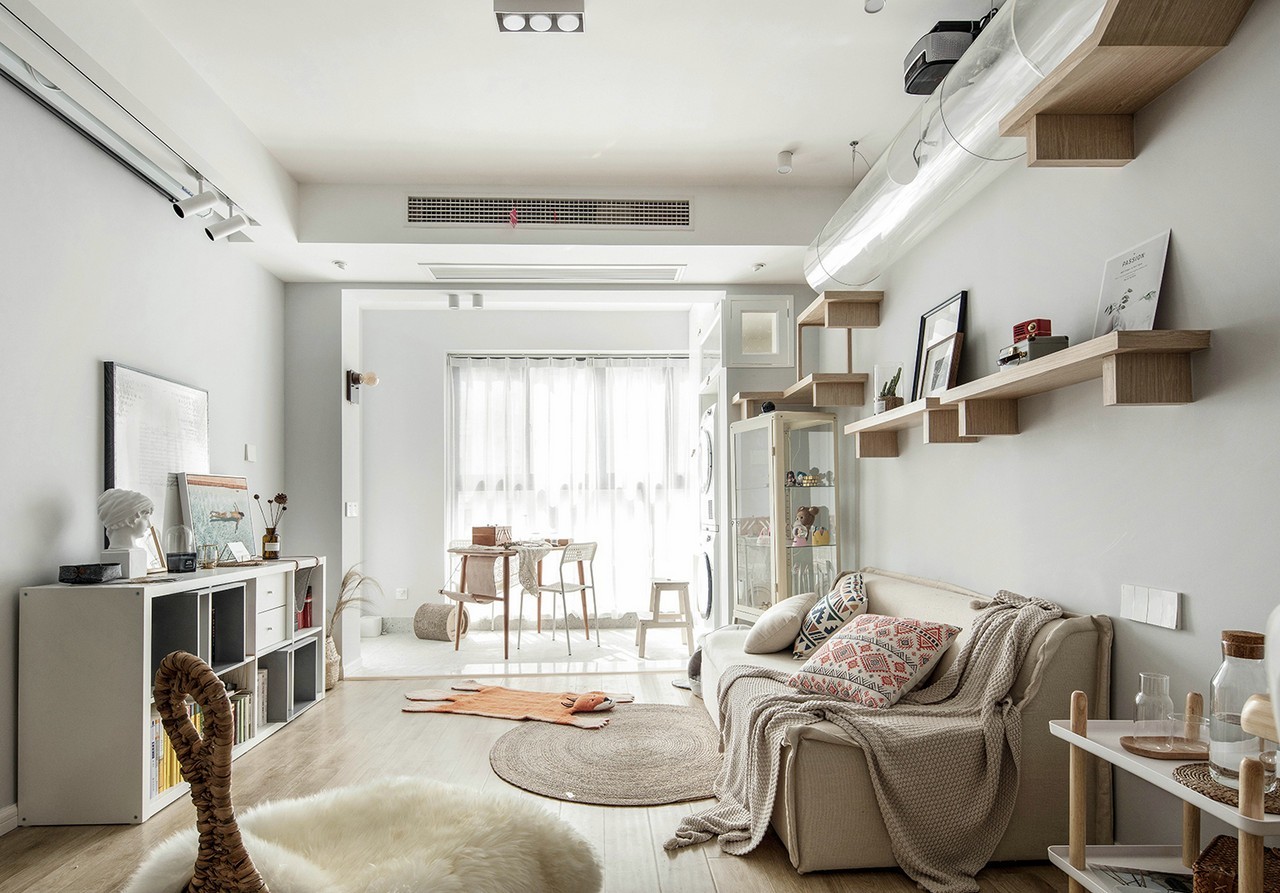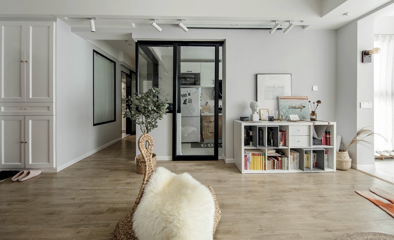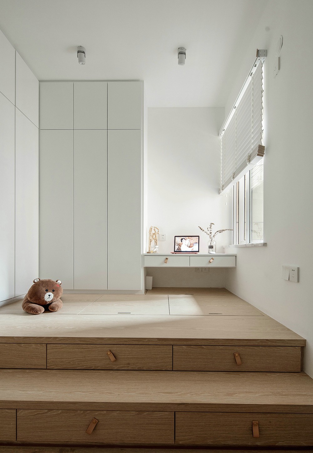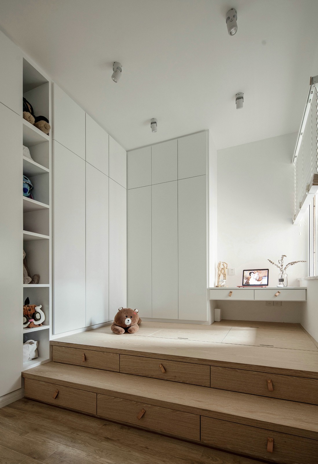 作为衣帽间(极少时候成为次卧),强大的储物是必不可少的,由于主卧没有衣柜的缘故,这个房间我们采用了大量的储物空间作为补充,整墙的转角衣柜、榻榻米式地台,墙面用白色减少闭塞感,地面用原木色呼应整体调性。