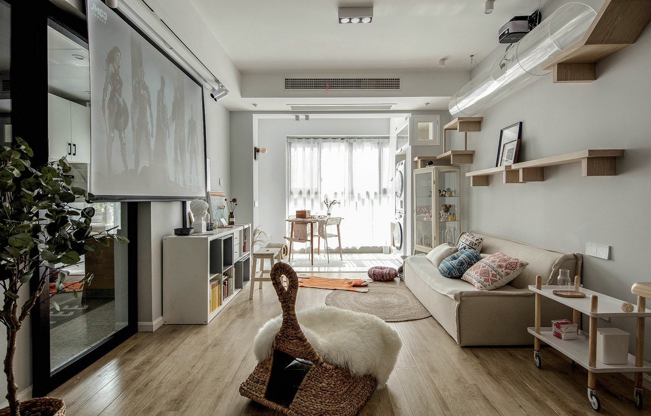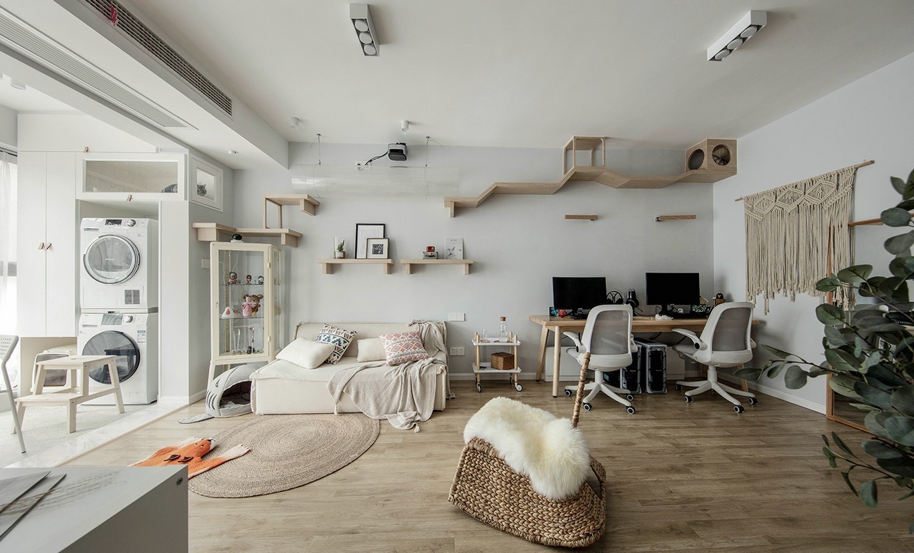 整个家里并没有电视机的需求,一套双座的懒人沙发+可开可合的投影足以满足女主们的观影需求,沙发的上空自然留给猫主子们上天遁地了。