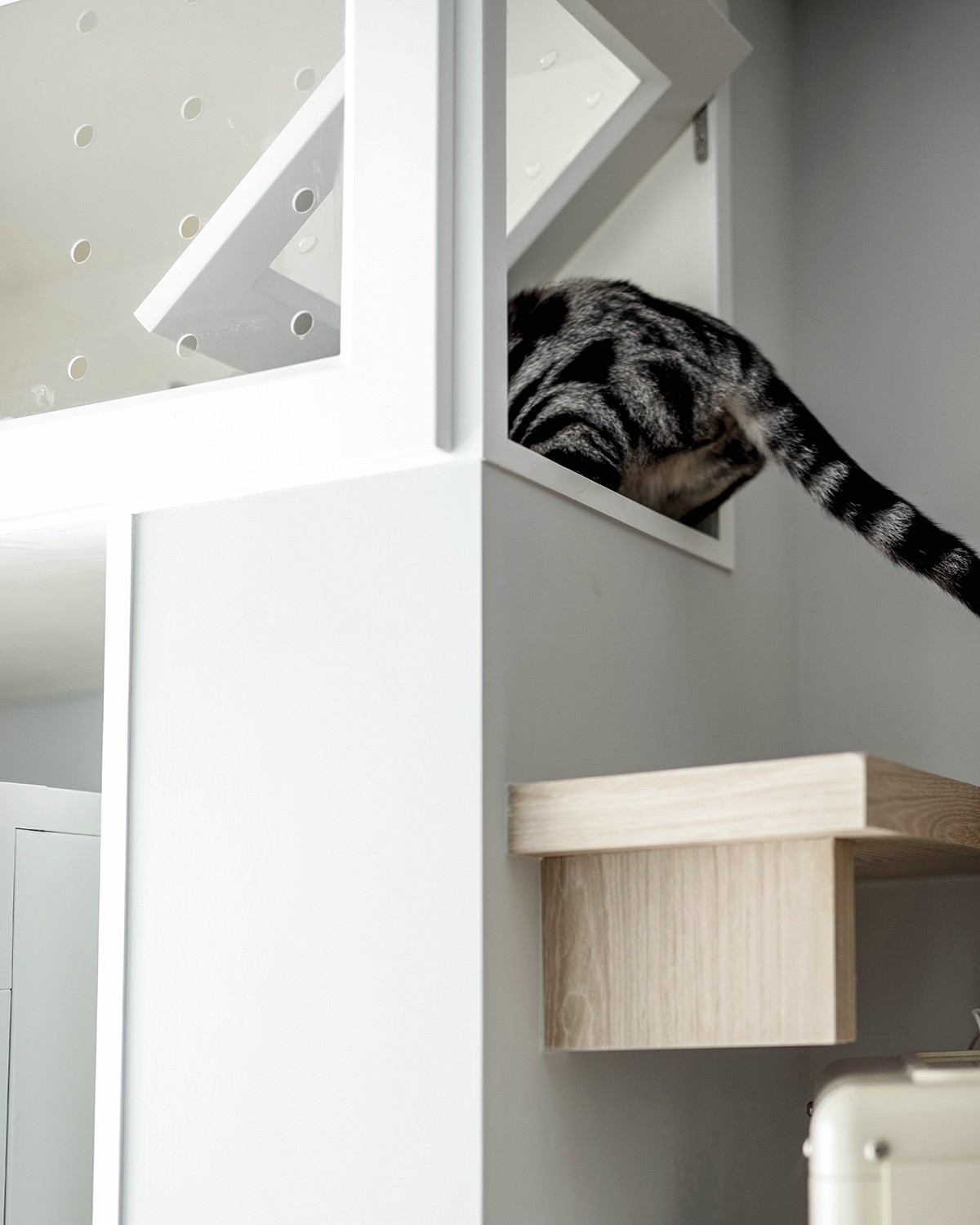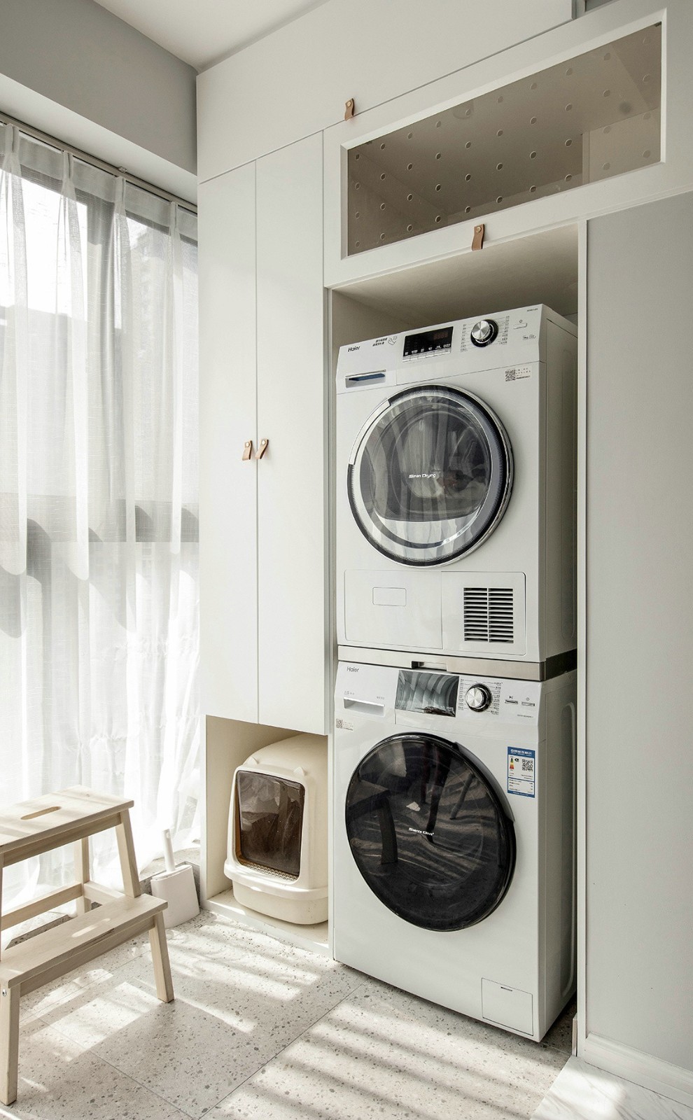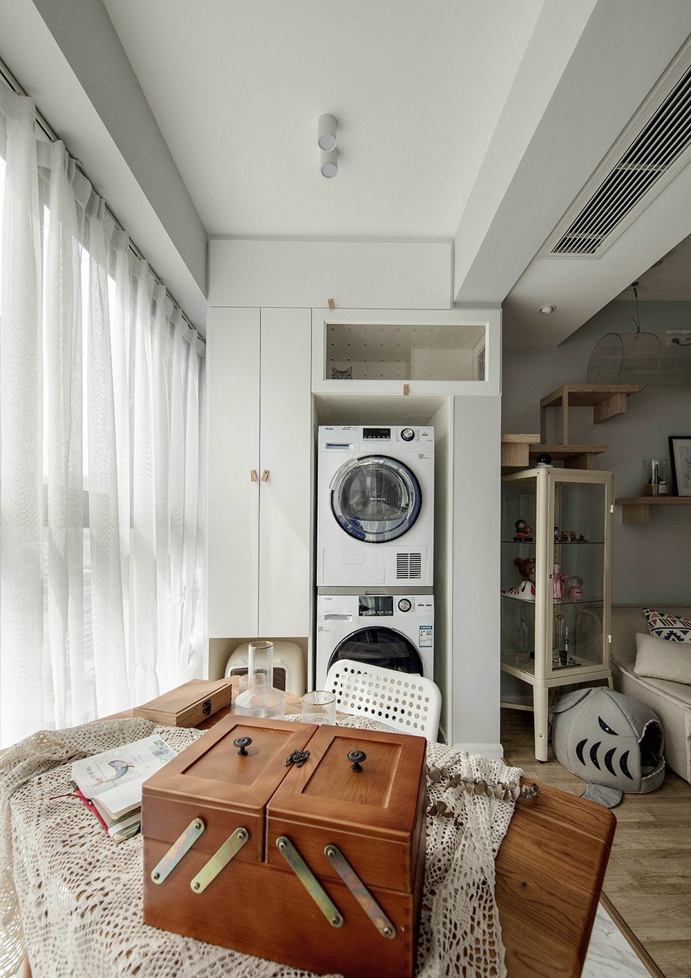 阳台的收纳是必不可少的,内陷的烘洗组合,左下角特地预留的猫砂盆区域,亚克力洞洞板的猫盒之外,一直延伸到房顶。