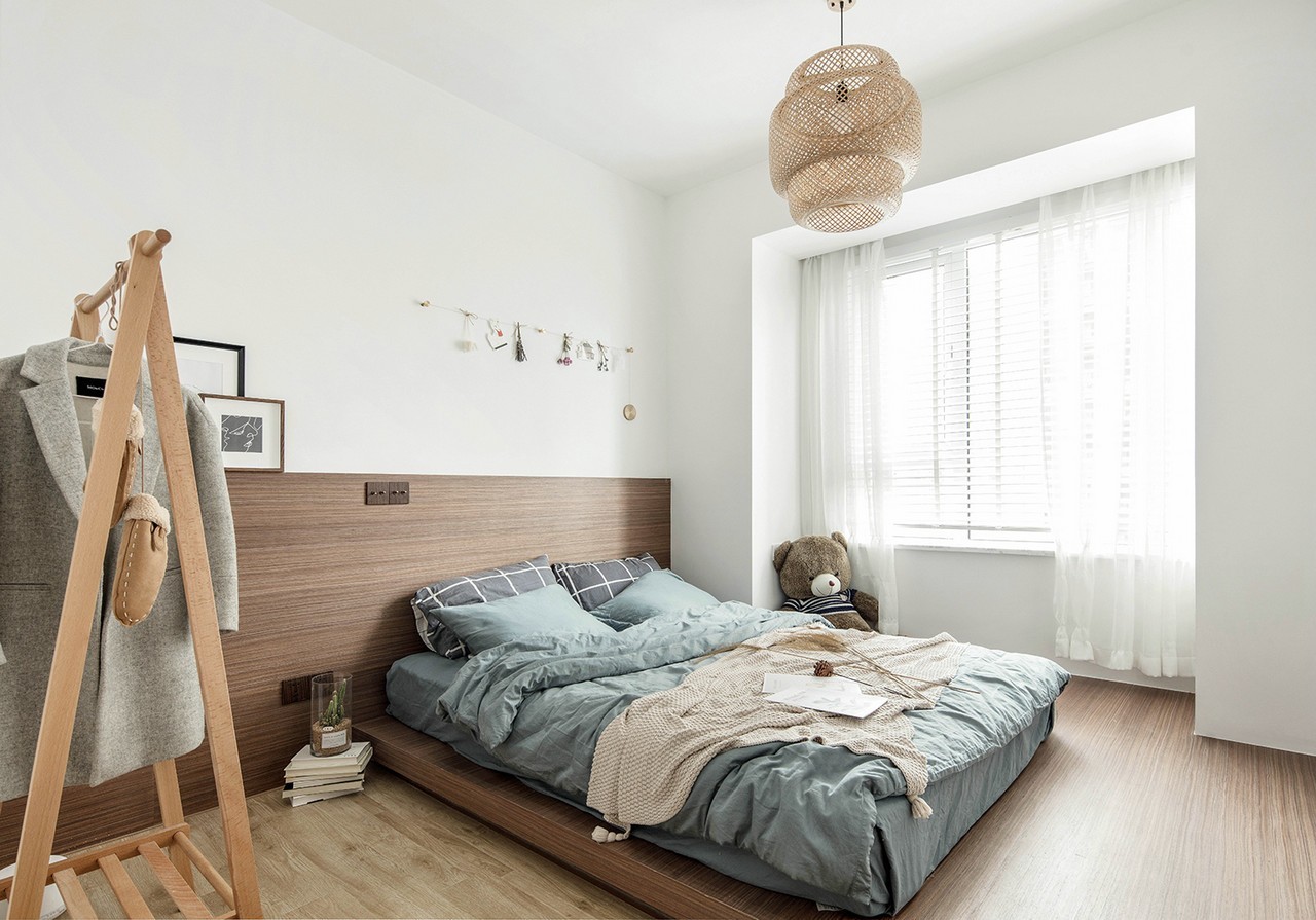 受了日式文化的熏陶,我们整个主卧采用了日式的地台床形式,床垫同时也可以根据心情变换不同的方向,可以靠着我们设计的护墙板,也可以背靠阳光,享受透过百叶帘映***的光斑。