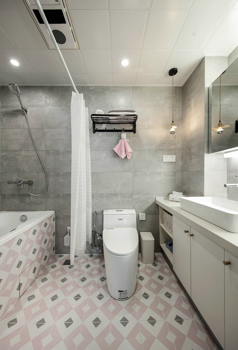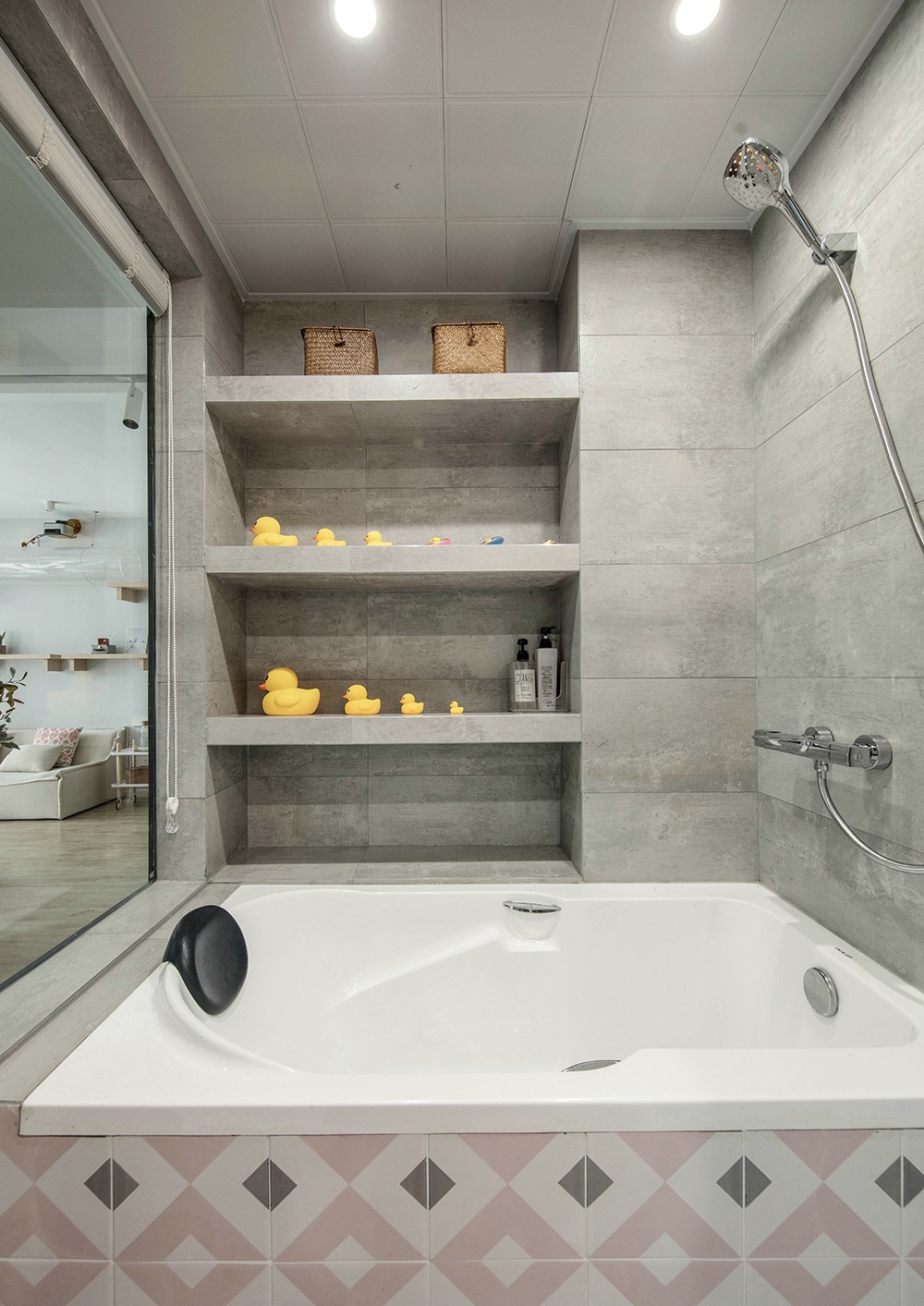 作为刚需的小浴缸,侧面我们利用包柱与墙体间的凹槽,制作了与墙面一致材质的大壁龛,经久耐用的同时也可以容纳卫生间的超多储物空间。