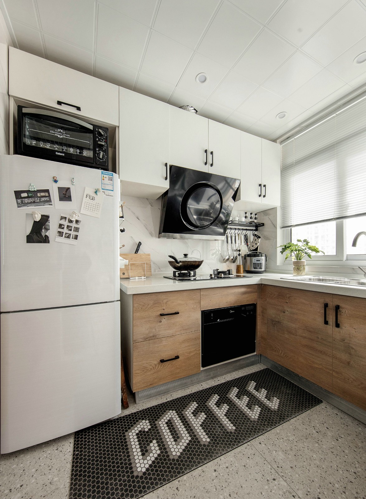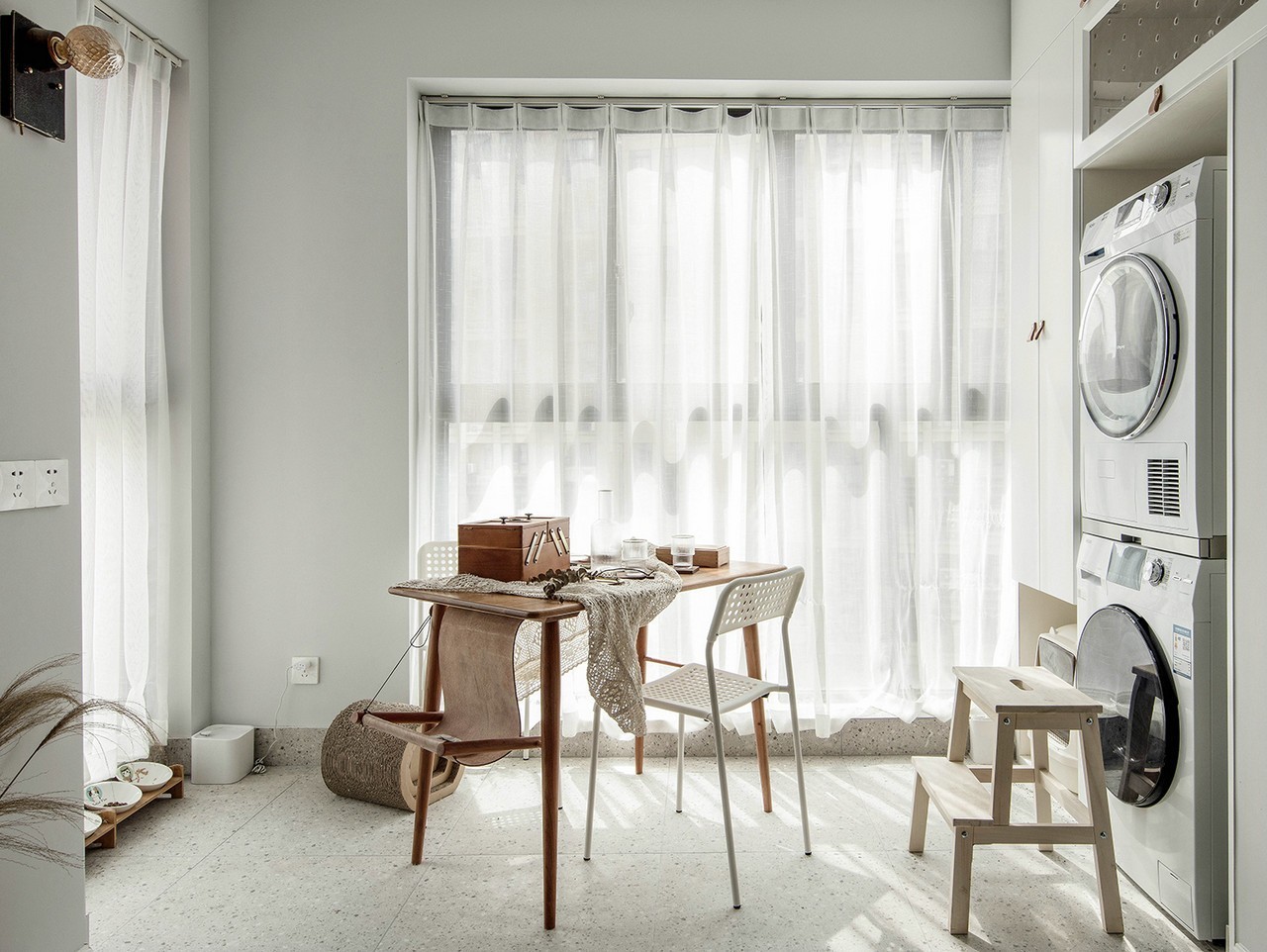 厨房原本做饭的需求并不大,但偶尔的厨艺切磋与小食还是必不可少。配色我们同样也选择了木与白的纯净加上水磨石的质朴,与整体呼应。