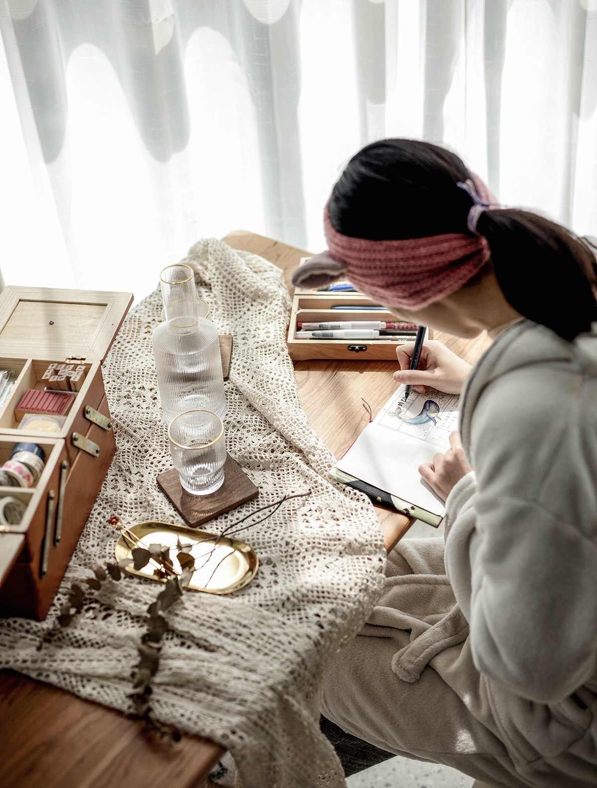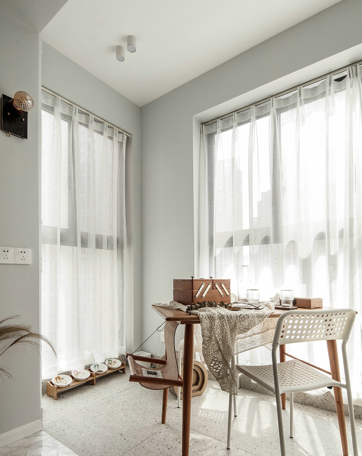 增大空间感也餐桌选择了尺寸较小的轻盈款,很容易移动,给喜欢做手工的女主人提供了一块完美的日光小房,充足的阳光。