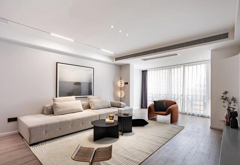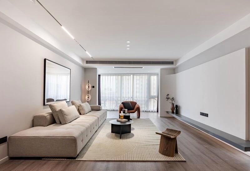 柔软的布艺沙发沿墙面展开,搭配同色系条纹地毯,带来视觉延伸感