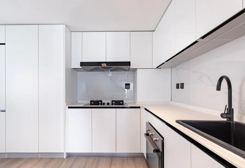 厨房区域方正,动线清晰,便于规划操作区域和置物区域,条理分明,视觉效果上简洁明快,空间宽敞便于行走。