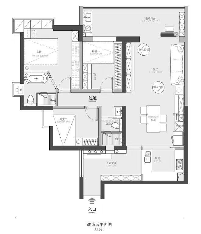 本套案例是旧房改造,原始主卫与玄关之间以.窗相连,入户处可能会有味道且客卫采光较差。厨房的热水器原本放在玄关处,所以原始玄关看起来杂乱。 本屋阳台可以看到广州塔,但是原始阳台有推拉门稍微遮挡视线,屋主希望将其打通变为开放式