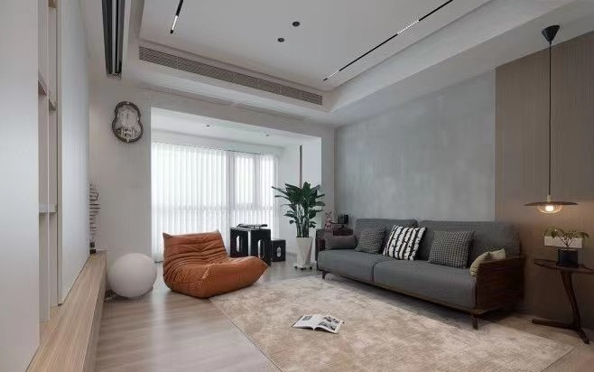 客厅简约通透,通铺木地板,木色、纯白与灰色构成空间主色调