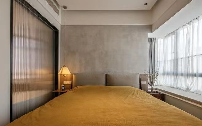卧室背景墙和客厅相呼应,灰色与纯白搭配温馨的床品,营造出舒适的睡眠氛围